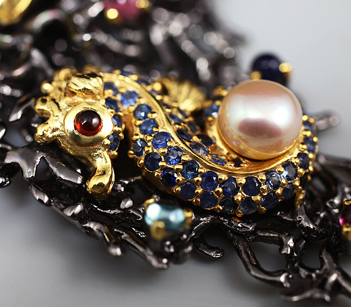 Серебро 925, Золочение, ЧернениеИнкрустация: Аметист, Гранат, Жемчуг, Сапфир, Турмалин, Цаворит гранат, ЦитринВес изделия: 46,2 граммРазмер: 95×53 мм