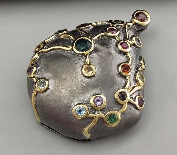 Кулон из матированного черненого стерлингового серебра 925 пробы с агатами, аметистами, гранатами, перидотами, родонитами и цаворит гранатами. Вес — 45,5 гр. Размер кулона — 36×28 мм. Выборочное золочение.