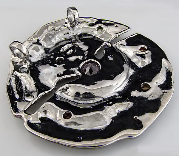 Кулон из черненого стерлингового серебра 925 пробы с аметистом (10 мм), оранжевыми цирконами, цитрином, топазом, перидотом и разноцветными сапфирами. Вес — 42,3 гр. Размер кулона — 62×61 мм. Выборочное золочение.