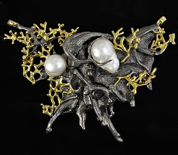 Кулон из черненого стерлингового серебра 925 пробы с круглым (13 мм) и фантазийным жемчугом (13×21 мм). Вес — 89,6 гр. Размер кулона — 104×82 мм. Выборочное золочение.