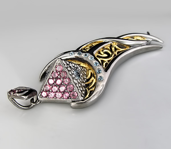 Кулон из черненого стерлингового серебра 925 пробы с родолитами гранатами и топазами. Вес — 33,85 гр. Размер кулона — 91×34 мм. Выборочное золочение.