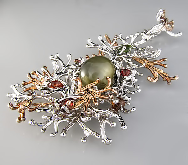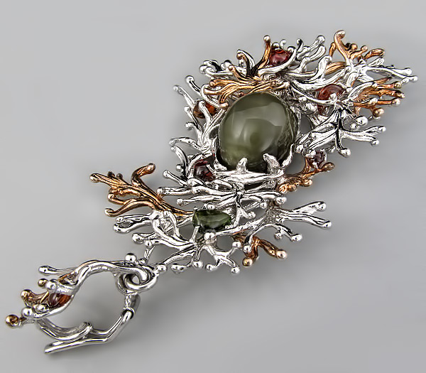 Кулон из родированного стерлингового серебра 925 пробы с разноцветными турмалинами кабошонами. Размер центральной вставки 14×16 мм. Вес — 31,3 гр. Размер кулона — 90×47 мм. Выборочное золочение.