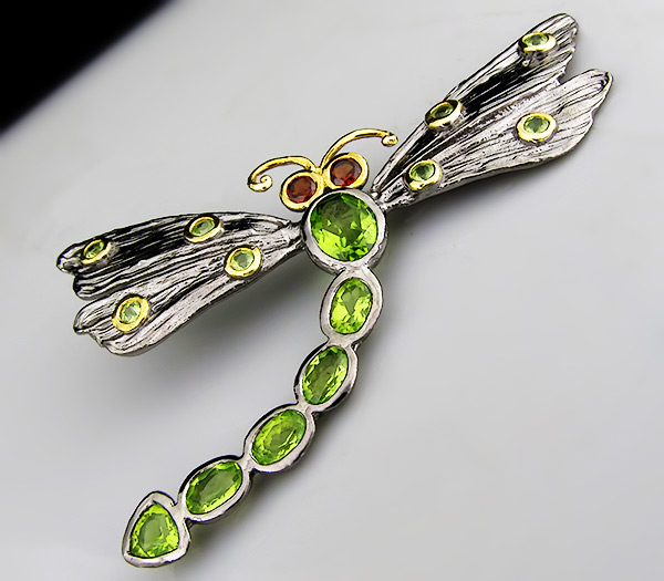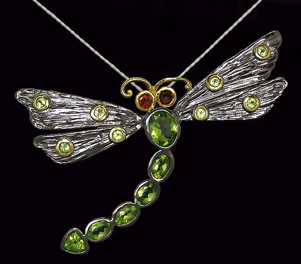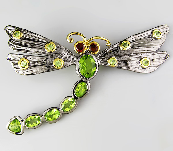 Кулон из серебра 925 пробы «Стрекоза» с перидотами и гранатами.Серебро 925, Золочение, Чернение Инкрустация: Гранат, Перидот Вес изделия: 13,7 грамм Размер: 66×42 мм
