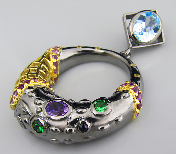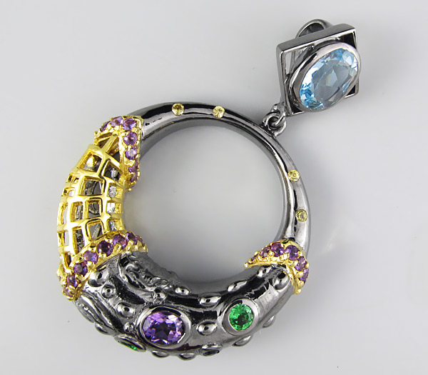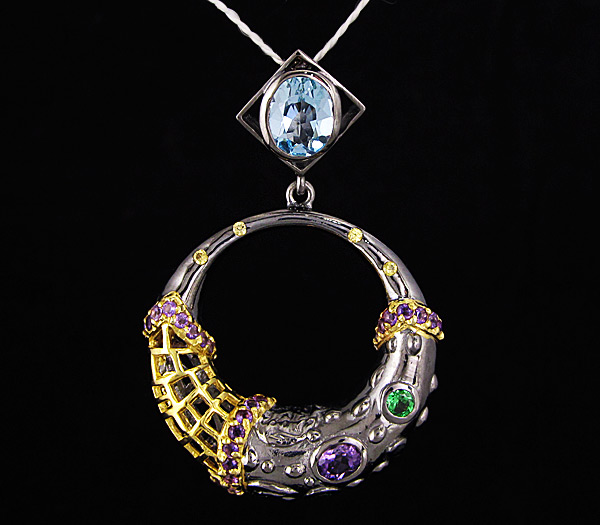 Кулон черненого из стерлингового серебра 925 пробы с аметистами, топазом, сапфирами и цаворитами гранатами. Вес 16,7 гр. Размер кулона — 51×33 мм. Выборочное золочение.