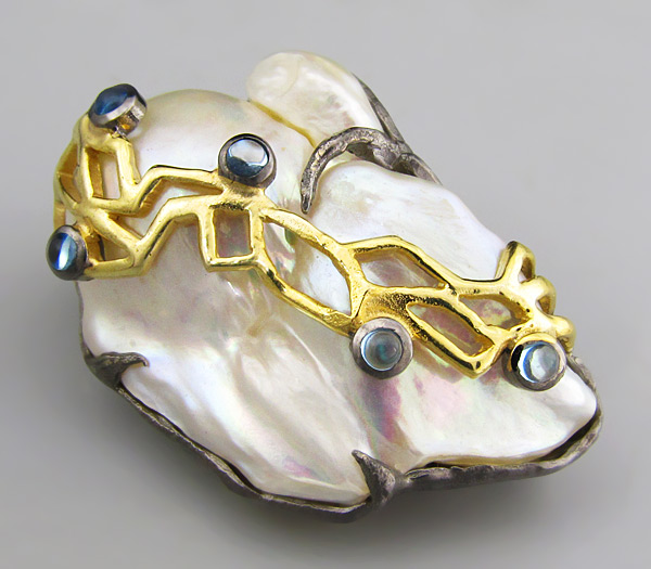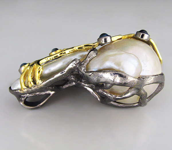 Кулон из черненого стерлингового серебра 925 пробы с жемчужиной и топазами. Вес 20,7 гр. Размер кулона — 40×30 мм. Выборочное золочение.