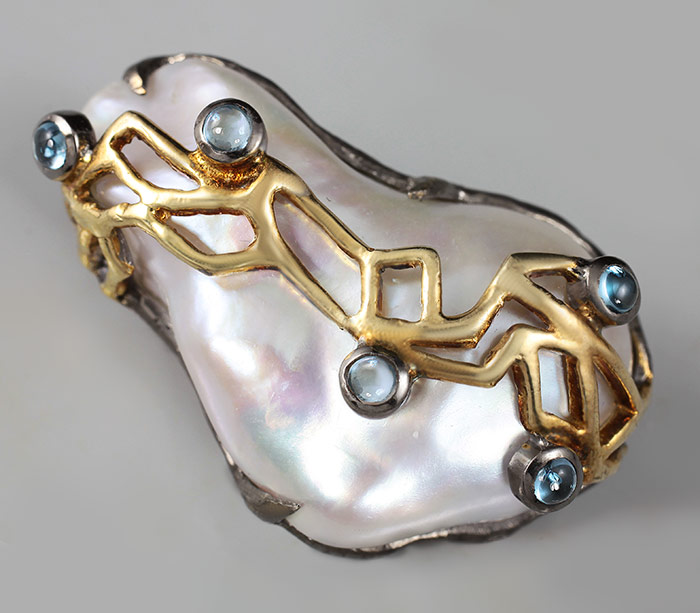 Кулон из черненого стерлингового серебра 925 пробы с жемчугом барокко и топазами. Вес — 14,2 гр. Размер кулона — 33×22 мм. Выборочное золочение