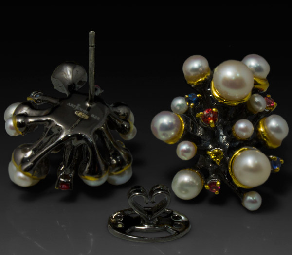 Серьги из черненого стерлингового серебра 925 пробы с жемчугом (3–5 мм) и разноцветными сапфирами. Выборочное золочение. Вес — 18,7 гр. Размер серег — 25×23 мм.