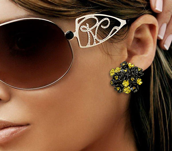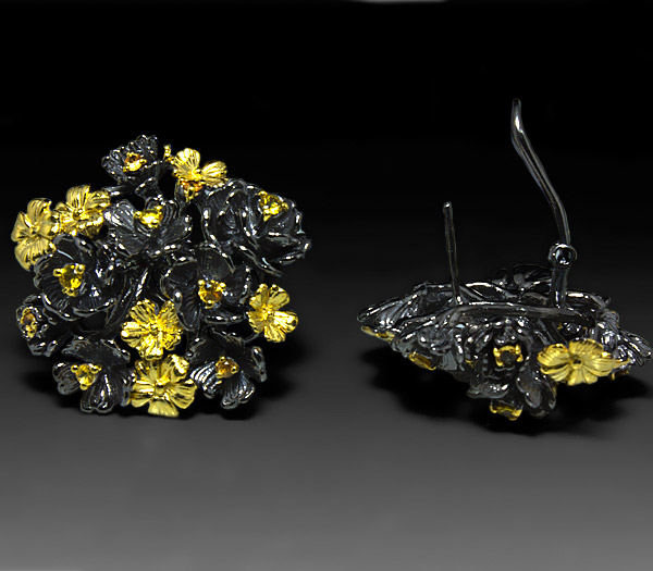 Серьги из черненого стерлингового серебра 925 пробы с разноцветными сапфирами. Выборочное золочение. Вес — 23,2 гр. Размер серег — 32×31 мм.