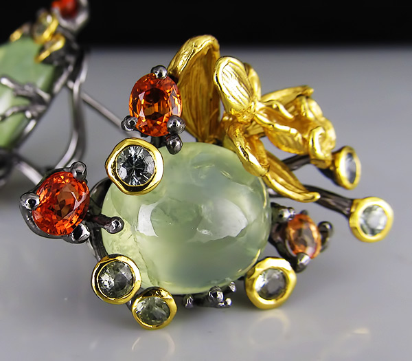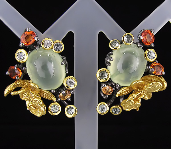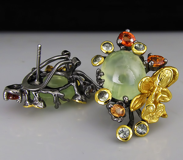 Серьги из черненого стерлингового серебра 925 пробы с пренитами и разноцветными сапфирами. Выборочное золочение. Вес — 15,5 гр. Размер серег — 32×24 мм.