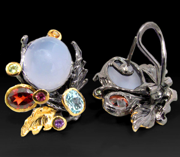 Серьги из черненого стерлингового серебра 925 пробы с крупными халцедонами (кабошоны 13×9 мм) и самоцветами. Выборочное золочение. Вес — 18,6 гр. Размер серег — 28×26 мм.