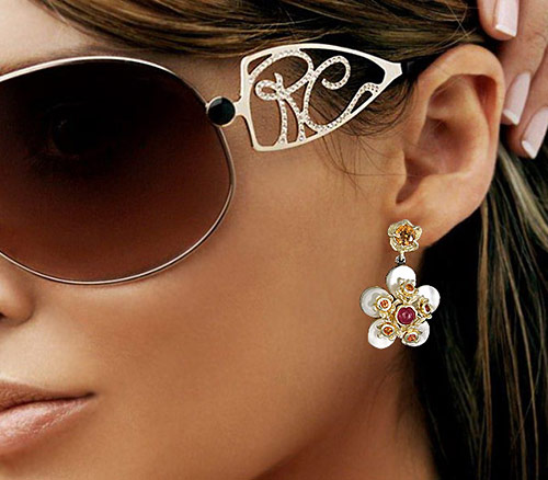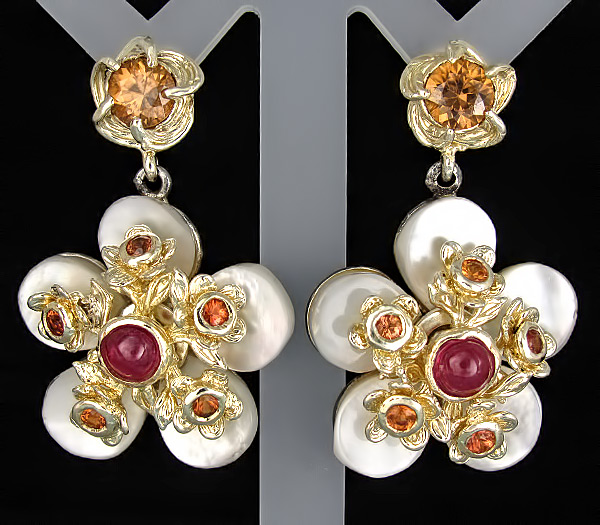 Серьги из позолоченного стерлингового серебра 925 пробы с цветными сапфирами, цитринами и перламутром. Вес — 19,2 гр. Размер серег — 39×25 мм.