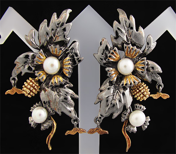 Серьги из черненого стерлингового серебра 925 пробы с жемчугом (6 мм). Вес — 23,0 гр. Размеры серег — 50×30 мм. Выборочное золочение.