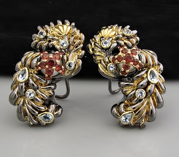 Серьги из черненого стерлингового серебра 925 пробы с топазами, гранатами и жемчугом. Вес — 29.6 гр. Размер серег — 37×20 мм. Выборочное золочение.