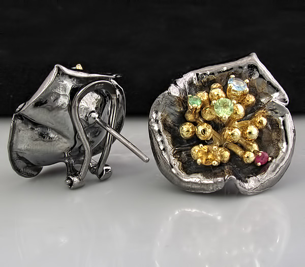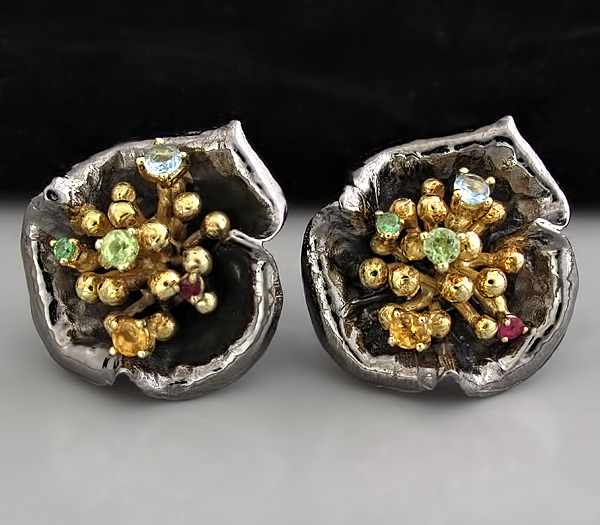 Серьги из черненого стерлингового серебра 925 пробы с топазами, цаворитами, перидотами, цитринами и рубинами. Вес — 16,1 гр. Размер серег — 27×26 мм. Выборочное золочение.