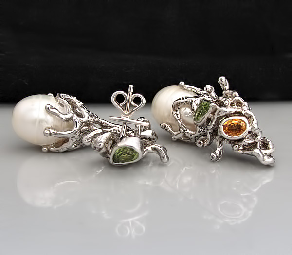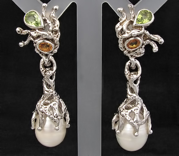 Серьги из стерлингового серебра 925 пробы с белыми каплевидными жемчужинами (16×11мм), перидотами и цитринами. Вес — 16,34 гр. Размер серег — 48×14 мм.