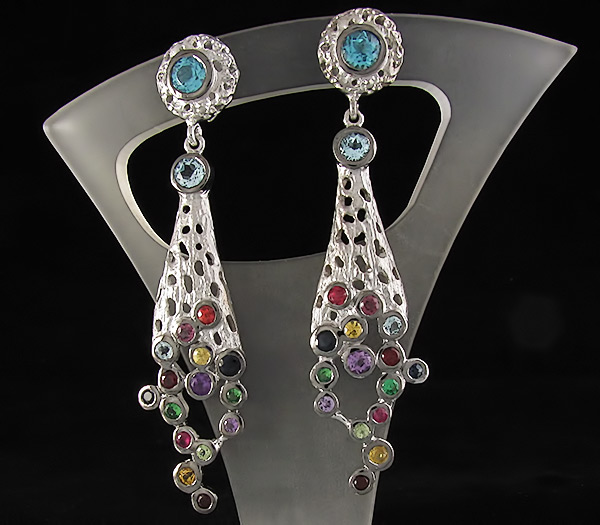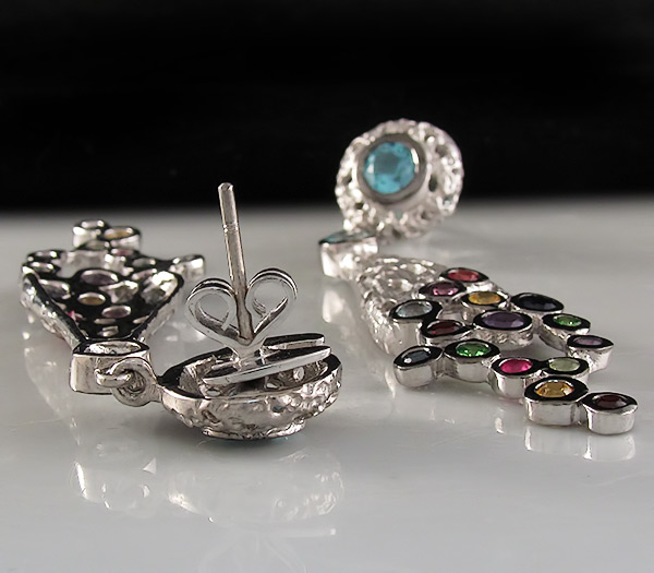 Серьги из матированного стерлингового серебра 925 пробы с топазами, гранатами, цаворитами, родолитами, цветными сапфирами, аметистами и перидотами. Вес — 12,4 гр. Размер серег — 63×15 мм. Выборочное чернение.