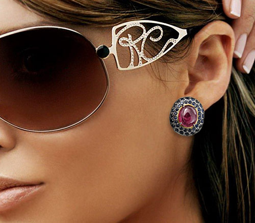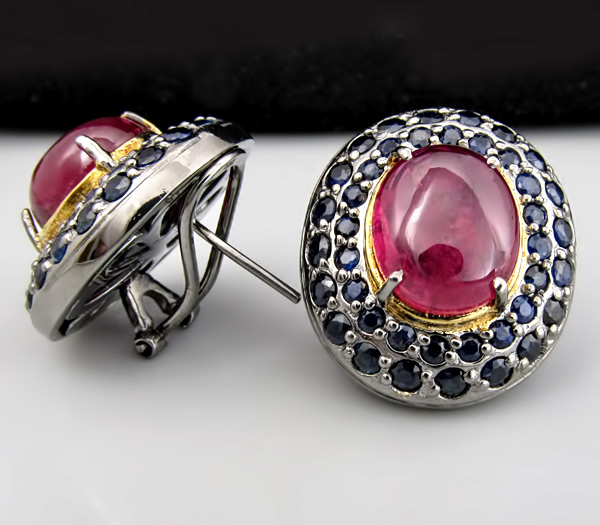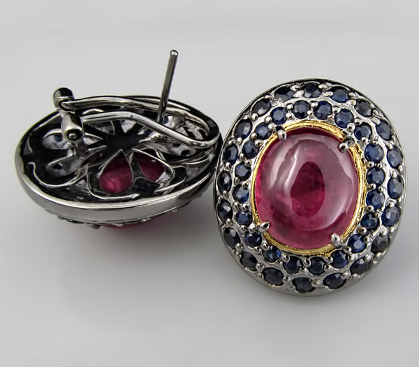Серьги из черненного стерлингового серебра 925 пробы с сапфирами. Размер центральных сапфиров кабошонов 13×11 мм. Вес — 25 гр. Размер серег — 26×23 мм. Выборочное золочение.
