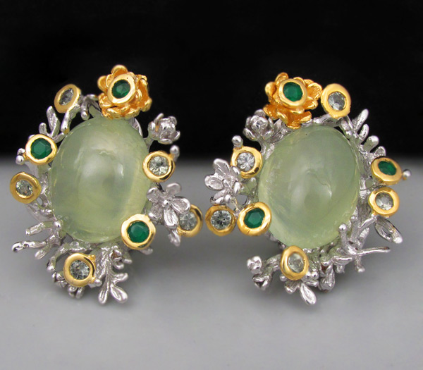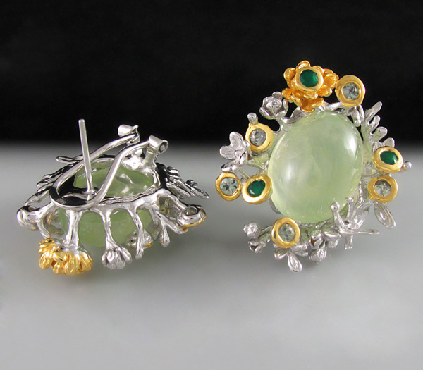 Серьги из родированного стерлингового серебра 925 пробы с пренитами (кабошоны 18×13 мм), зелеными агатами и сапфирами. Вес — 24,4 гр. Размер серег — 33×29 мм. Выборочное золочение.