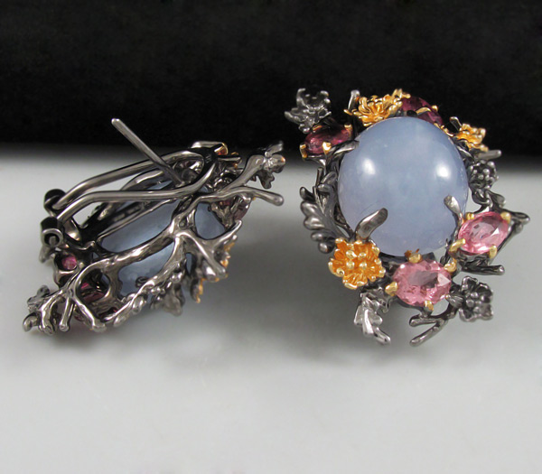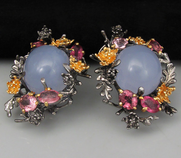 Серьги из черненого стерлингового серебра 925 пробы с кабошонами халцедона (15мм) и турмалинами. Вес — 19,8 гр. Размер серег — 32×24 мм. Выборочное золочение.