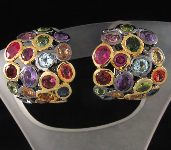 Серьги из черненого стерлингового серебра 925 пробы с турмалинами, мозамбикскими гранатами и родолитами гранатами, топазами, аметистами, перидотами и разноцветными сапфирами. Вес — 12,9 гр. Размер серег — 22×19 мм. Выборочное золочение.