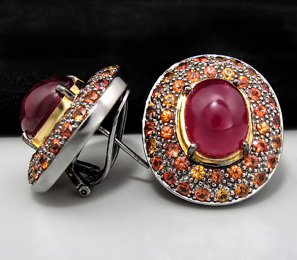 Серьги из черненого стерлингового серебра 925 пробы с сапфирами. Вес — 23,4 гр. Размер серег — 27×24 мм. Размер центральной вставки 10×13 мм (кабошон). Выборочное золочение.