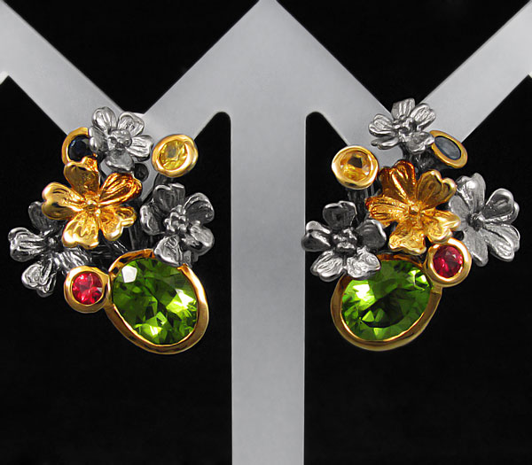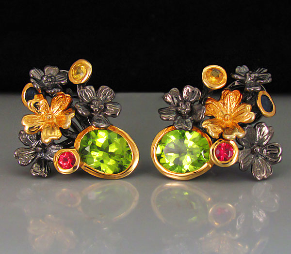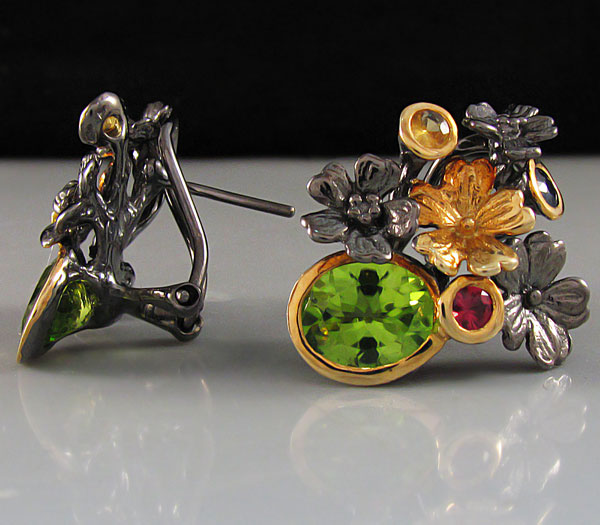 Серьги из черненого текстурного стерлингового серебра 925 пробы с перидотами (10×7 мм) и разноцветными сапфирами. Вес — 11,8 гр. Размер серег — 26×24 мм. Выборочное золочение.