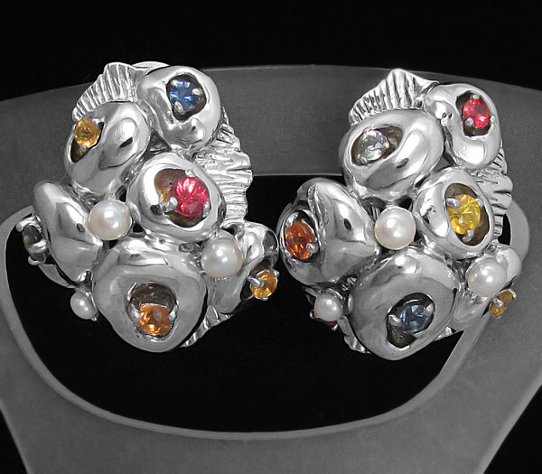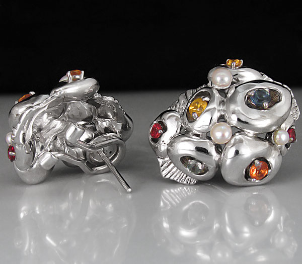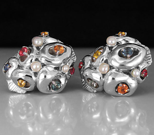 Серьги из родированного стерлингового серебра 925 пробы с жемчугом и разноцветными сапфирами. Вес — 16,1 гр. Размер серег — 25×21 мм.