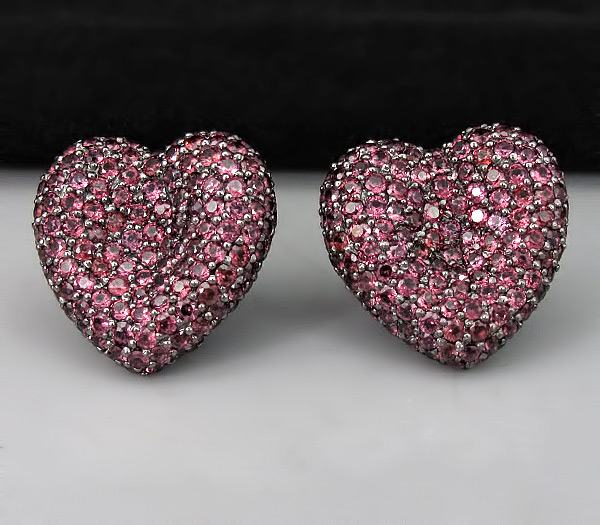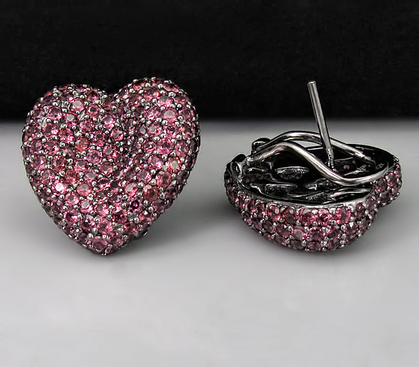 Серьги из черненого стерлингового серебра 925 пробы с родолитами гранатами. Вес — 11,5 гр. Размер серег — 20×20 мм.