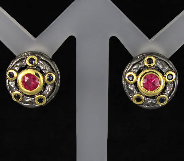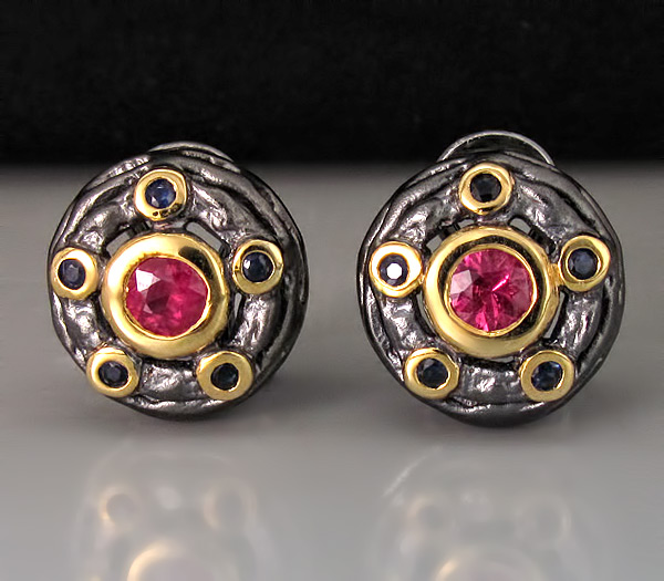 Серьги из черненого стерлингового серебра 925 пробы с сапфирами. Вес — 6,7 гр. Размер серег — 14×13 мм. Выборочное золочение.