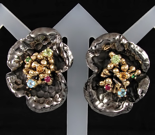 Серьги из черненого стерлингового серебра 925 пробы с цаворитами гранатами, сапфирами, топазами, перидотами и цитринами. Вес — 15,3 гр. Размер серег — 31×24 мм. Выборочное золочение.