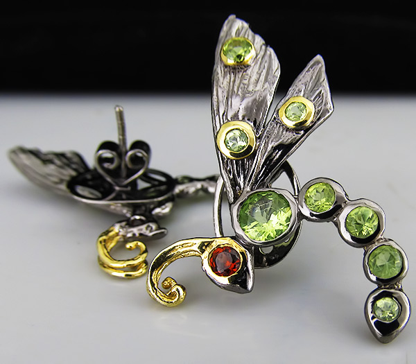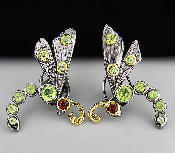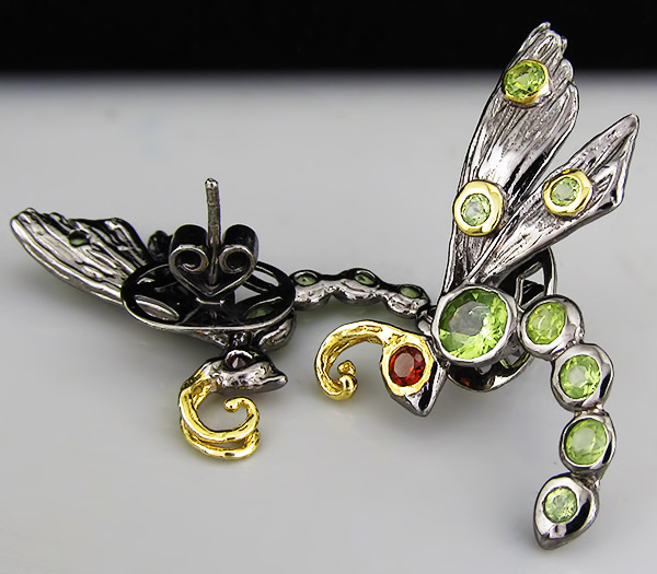Серьги из серебра 925 пробы «Стрекоза» с перидотами и гранатами.Серебро 925, Золочение, Чернение Инкрустация: Гранат, Перидот Вес изделия: 8,2 грамм Размер: 33×24 мм