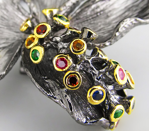 Серебро 925, Золочение, ЧернениеИнкрустация: Аметист, Гранат, Сапфир, Цаворит гранат, ЦитринВес изделия: 20,1 граммРазмер: 38×32 мм