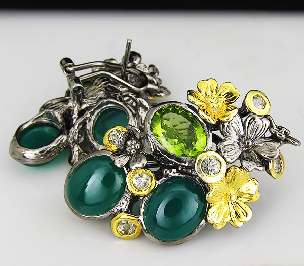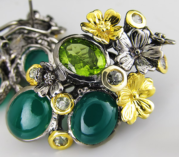 Серьги из черненого стерлингового серебра 925 пробы с зелеными агатами, перидотами и сапфирами. Вес — 23,9 гр. Размер серег — 38×29 мм. Выборочное золочение.