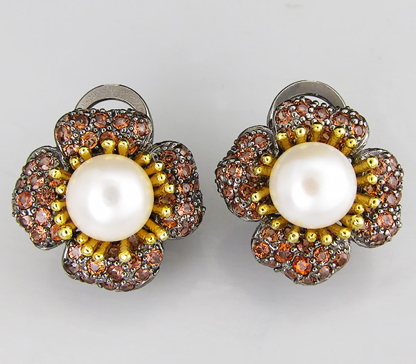 Серьги из черненого стерлингового серебра 925 пробы с жемчугом и гранатами. Вес — 9,5 гр. Размер серег — 19×19 мм. Выборочное золочение.