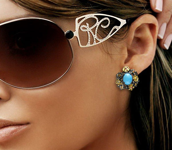 Серьги из черненого стерлингового серебра 925 пробы с бирюзой и разноцветными сапфирами. Вес — 16,4 гр. Размер серег — 23×21 мм. Выборочное золочение.