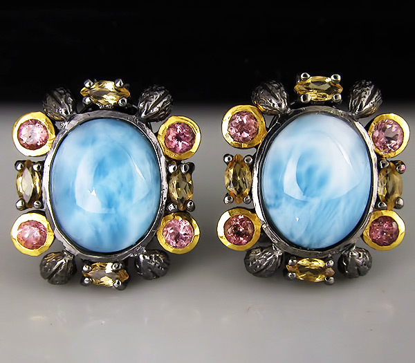 Серьги из черненого стерлингового серебра 925 пробы с ларимарами, сапфирами и цитринами. Вес — 7,5 гр. Размер серег — 18×16 мм. Выборочное золочение.