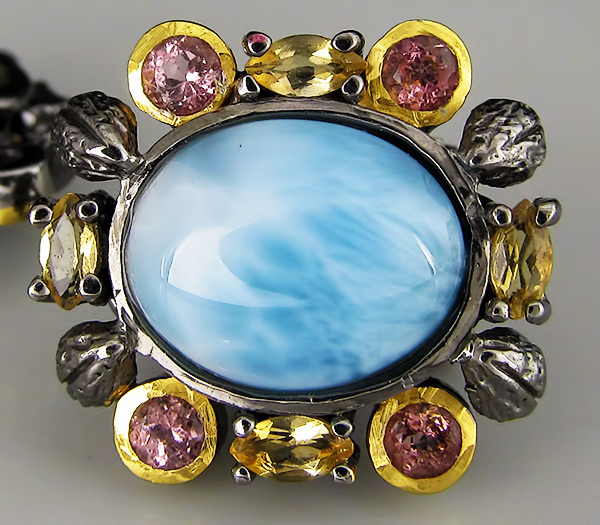 Серьги из серебра 925 пробы с ларимаром, розовыми сапфирами и цитринами.Серебро 925, Золочение, Чернение Инкрустация: Ларимар, Сапфир, Цитрин Вес изделия: 7,5 грамм Размер: 18×16 мм