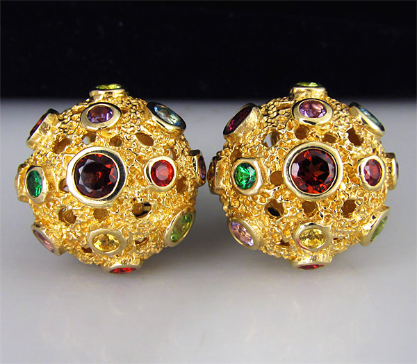Серьги из позолоченного стерлингового серебра 925 пробы с мозамбикскими и цаворитами гранатами, аметистами, перидотами, топазами и сапфирами. Вес — 12,8 гр. Размер серег — 19×19 мм.