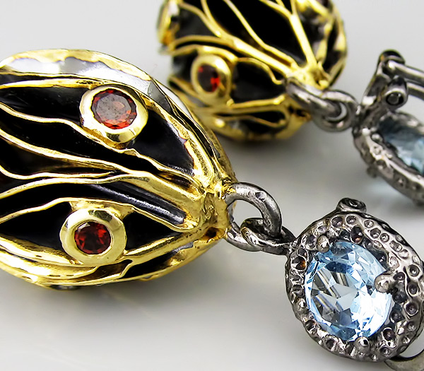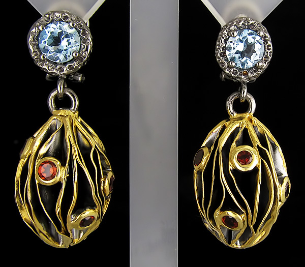 Серьги из черненого стерлингового серебра 925 пробы с топазами и гранатами. Вес — 20,3 гр. Размер серег — 39×16 мм. Выборочное золочение.