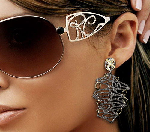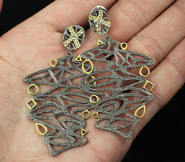 Серьги из черненого стерлингового серебра 925 пробы с бесцветными топазами. Вес — 20,7 гр. Размер серег — 71×42 мм. Выборочное золочение.