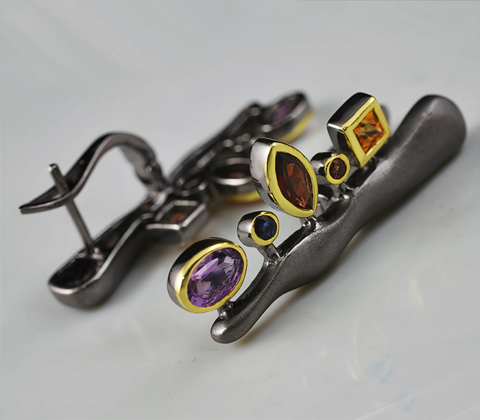 Серьги из черненого стерлингового серебра 925 пробы с разноцветными сапфирами, гранатами и аметистами. Вес — 8,3 гр. Размер серег — 33×14 мм. Выборочное золочение и матирование.