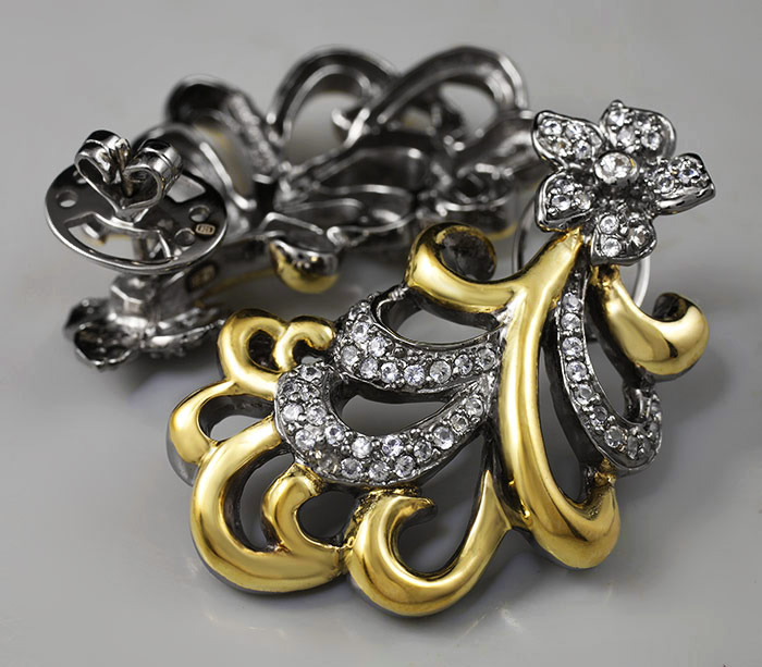 Серьги из черненого стерлингового серебра 925 пробы с бесцветными сапфирами. Вес — 21,4 гр. Размер серег — 41×26 мм. Выборочное золочение.