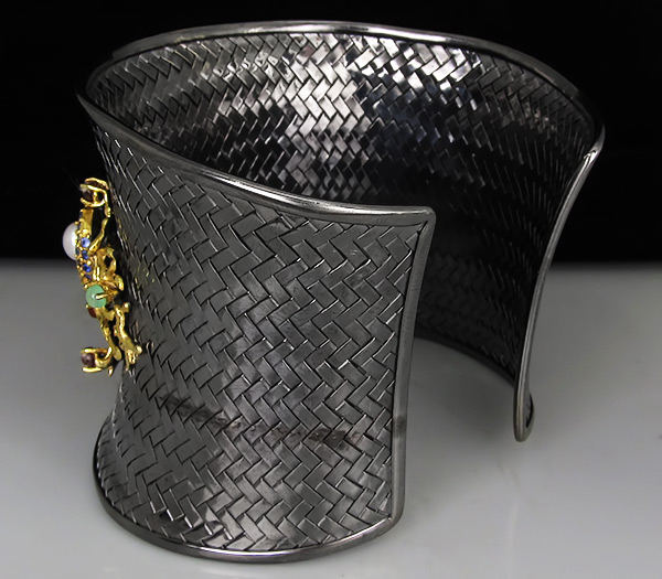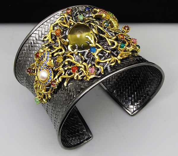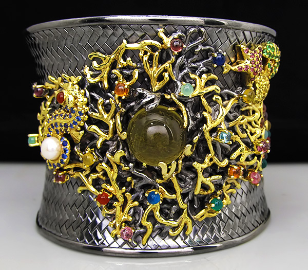Браслет из черненого стерлингового серебра 925 пробы с цитрином (кабошон 13 мм), жемчугом, зелеными агатами, разноцветными сапфирами, аметистами, разноцветными турмалинами, родолитами и цаворитами гранатами. Общая масса вставок 20,1 карат. Выборочное золочение. Длина браслета по окружности 170 мм, ширина — 59 мм. Вес — 104,5 гр.
