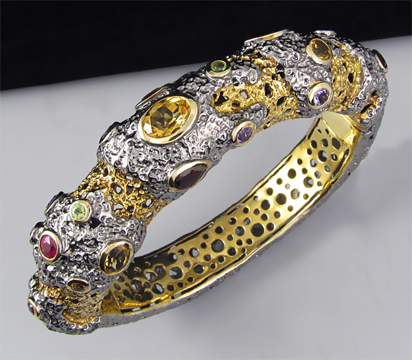 Браслет из серебра 925 пробы с цитринами.Серебро 925, Золочение, Чернение Инкрустация: Аметист, Гранат, Перидот, Рубин, Цитрин Вес изделия: 54,1 грамм Размер: 80×17 мм