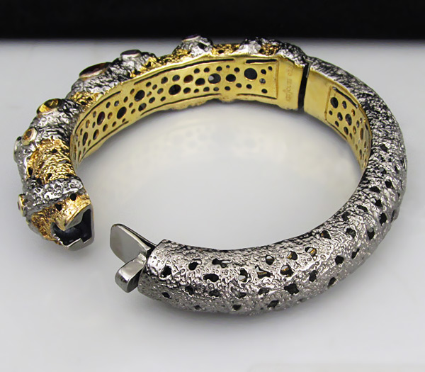 Браслет из черненого стерлингового серебра 925 пробы с цитринами. Выборочное золочение. Размер — 80×17 мм. Вес — 54,1 гр.
