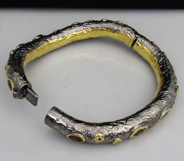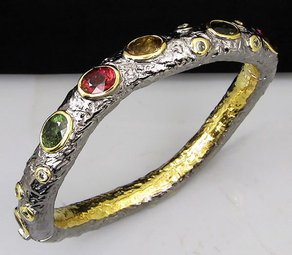 Браслет из черненого стерлингового серебра 925 пробы с разноцветными турмалинами (6×4 мм) и зелеными сапфирами. Вес — 44,3 гр. Размер площадки — 80×10 мм. Выборочное золочение.