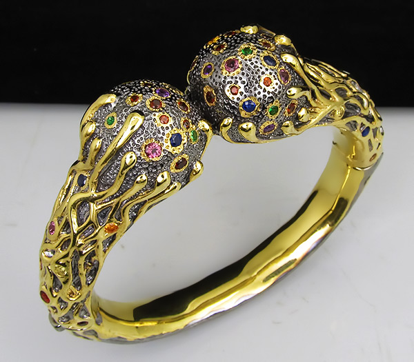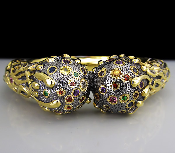Браслет из черненого стерлингового серебра 925 пробы с самоцветами. Выборочное золочение. Вес — 65,5 гр. Размер площадки — 77×20 мм.