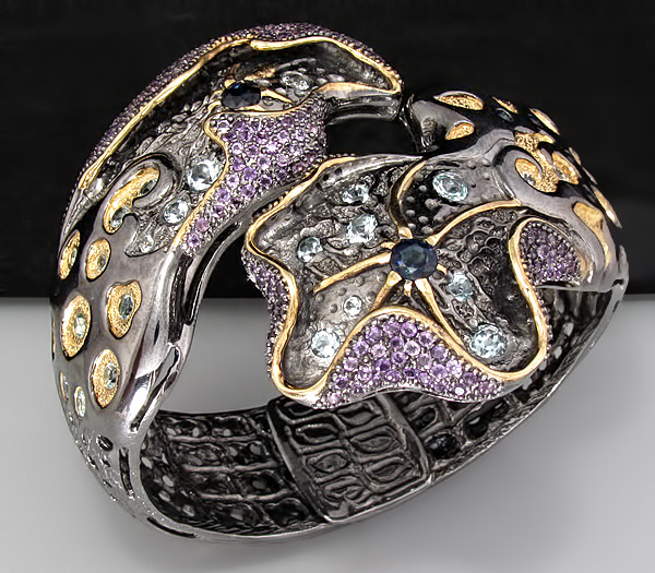 Браслет из черненого стерлингового серебра 925 пробы с аметистами, топазами и сапфирами. Вес браслета — 91,7 гр. Площадка браслета — 74×62 мм. Выборочное золочение.