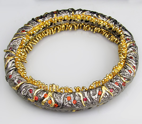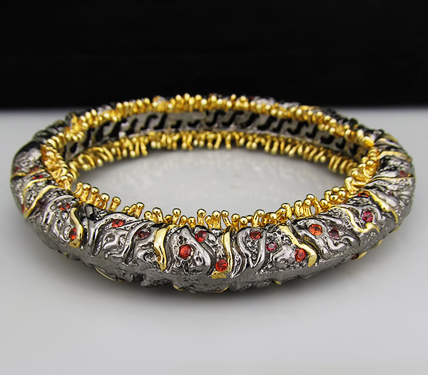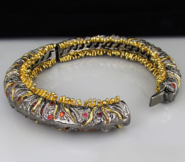 Браслет из черненого стерлингового серебра 925 пробы с сапфирами. Вес браслета — 67,3 гр. Площадка браслета — 76×13 мм. Выборочное золочение.