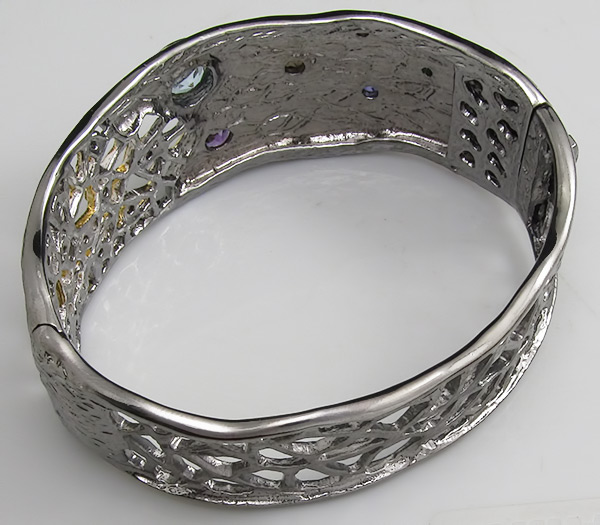 Браслет из черненого стерлингового серебра 925 пробы с аметистами, топазами, дымчатым кварцем, перидотами, разноцветными сапфирами, цаворитами, родолитами и мозамбкскими гранатами. Вес браслета — 60,5 гр. Площадка браслета — 73×28 мм. Выборочное золочение и матирование.